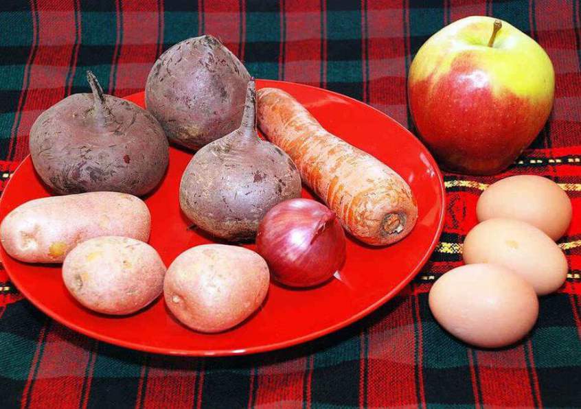 4. Приготовленные овощи (свёклу, картофель, морковь) очистите от кожуры, яйца очистите от скорлупы, яблоки очистите от кожицы, лук очистите от шелухи.