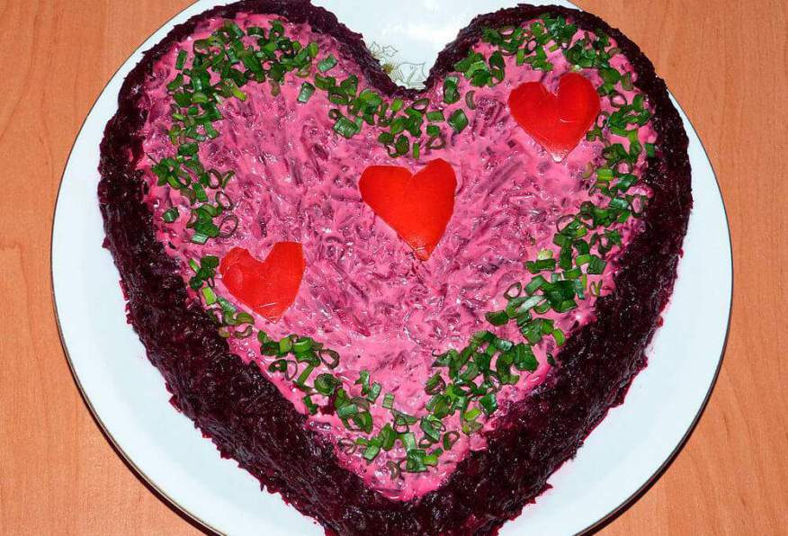 8. Салат «Сельдь под шубой» в виде сердца готов. Поставьте его в холодильник на несколько часов, чтобы настоялся, а затем подавайте к столу.