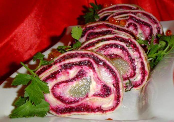 9. Достаньте салат «Селедка под шубой» из морозилки, порежьте на роллы и сразу подайте к столу.