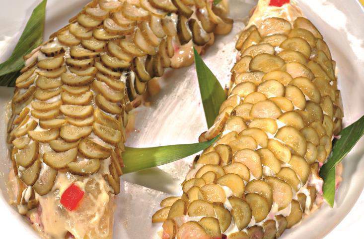 7. Нарежьте тонкими ломтиками малосольные огурцы и уложите их сверху в виде чешуи. Сделайте рыбьи плавники из листьев лука.