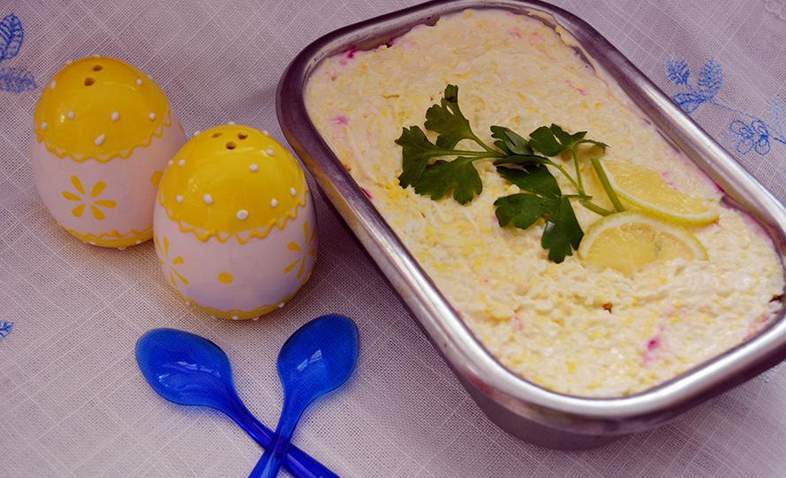 6. Яйца очистите от скорлупы, натрите на мелкую терку, насыпьте слоем на свёклу, посолите немного и смажьте майонезом.