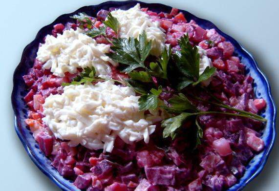 6. Переложите заправленный винегрет в салатник разровняйте и украсьте «кистями белой сирени». Для этого разложите веточки петрушки, дополнив их тертым на терке белком вареных яиц, смешанным с майонезом.