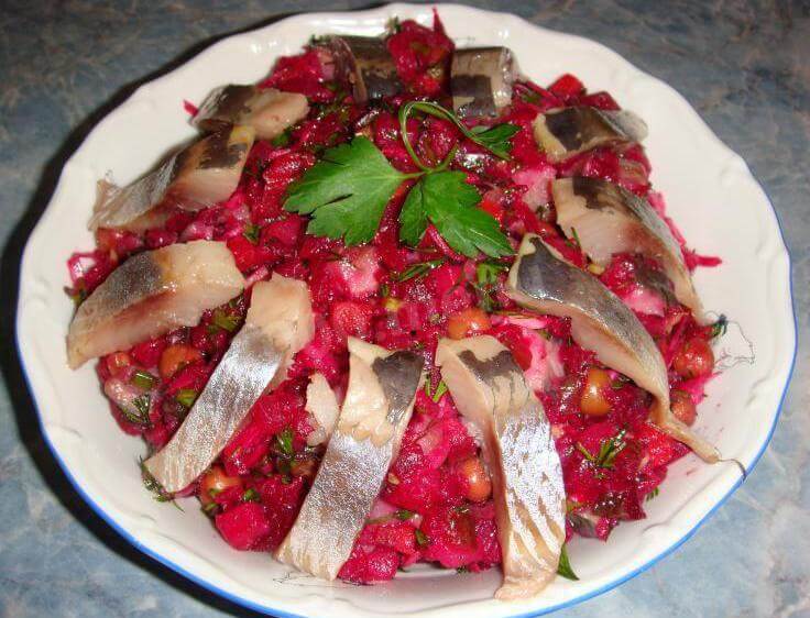 6. Переложите приготовленный винегрет в глубокий салатник, выложите сверху ломтики сельди, украсьте листиками петрушки.
