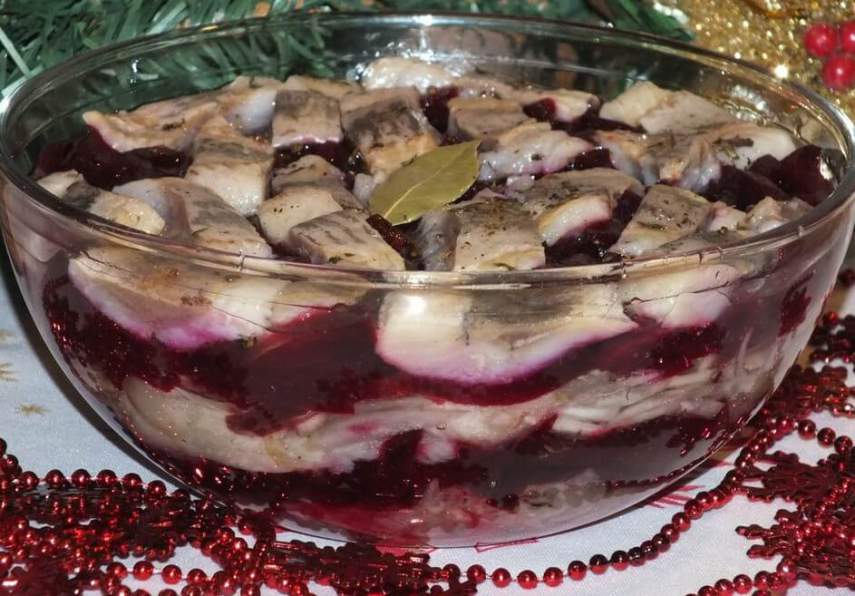 5. В прозрачный салатник уложите слоями в следующей последовательности: половина лука, чеснок, половина свёклы, половина селедки, посыпьте щепоткой тимьяна и кайенского перца. Затем снова в том же порядке: Оставшийся лук, чеснок, свёклу, селедку, посыпьте щепоткой кайенского перца и тимьяна.
