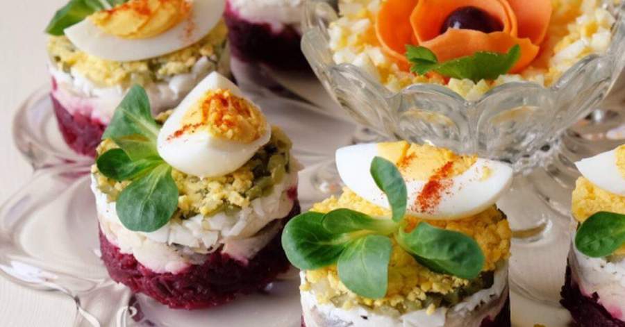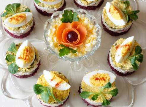 6. Оставшиеся 2 яйца разрежьте вдоль на четвертинки. Каждую порцию салата украсьте зеленью по вкусу и положите четвертинку яйца. Селедочный салат со свёклой (порционный) готов.