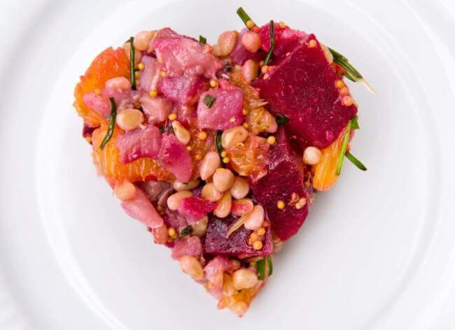 Выложенный в форме сердца салат может состоять из самых обычных ингредиентов, как в данном случае, но при этом иметь эффектный внешний вид и замечательный вкус. Казалось бы, не сочетаемые продукты сельдь и апельсин вместе со свекольным ингредиентом создают изумительный вкусовой эффект. Зерновая горчица вместе со шнитт-луком и кедровыми орешками придаст салату особые пикантные нотки.