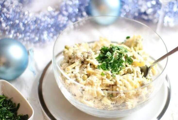 5. Оставьте салат на 30-40 минут на столе, чтобы соединились вкусы всех ингредиентов в одно целое, а затем подайте на праздничный стол или для домашней трапезы. Охлаждать салат перед подачей нет необходимости.