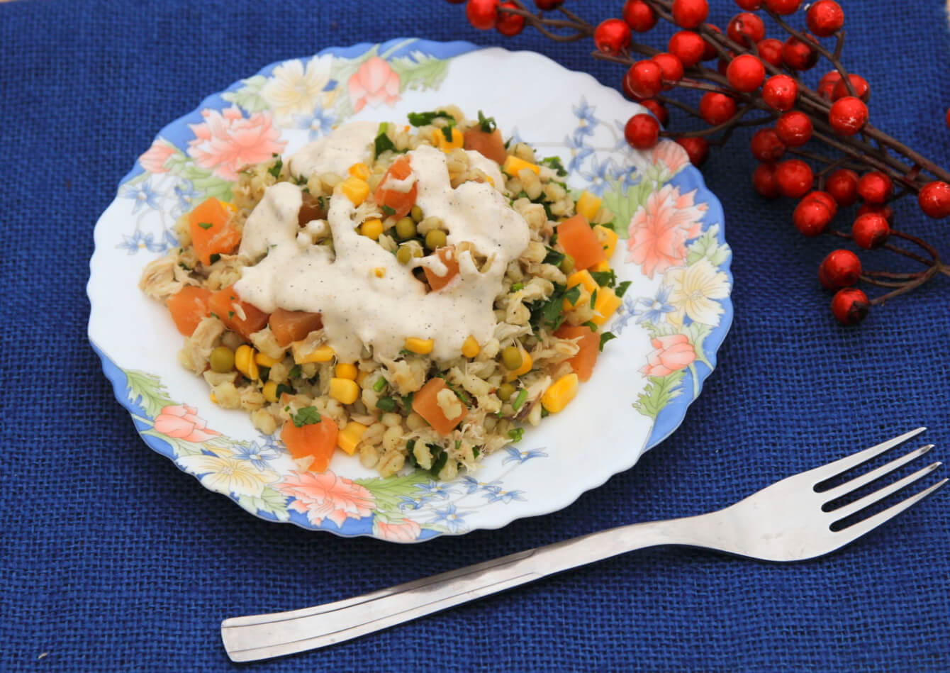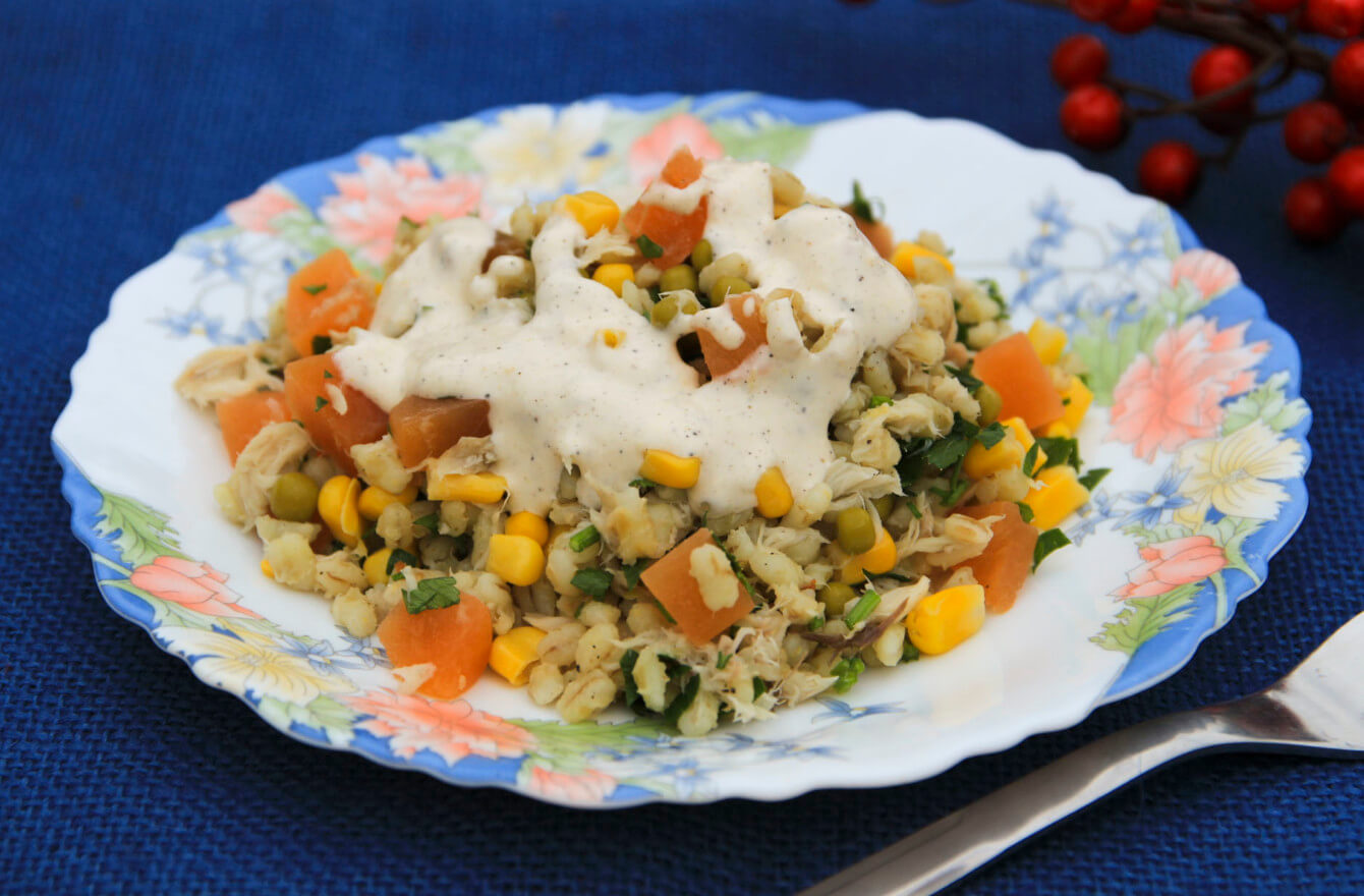 7.Салат из копченой скумбрии с перловкой станет часто появляться в вашем домашнем меню. Ведь он не только красочный, вкусный и полезный, но состоит из доступных ингредиентов.
