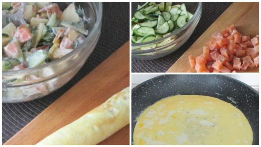 5. Разогрейте сковороду с небольшим количеством растительного масла и пожарьте на ней один или два омлета. Горячий омлет сверните в трубочку, прижмите, затем нарежьте тонкими кусочками.