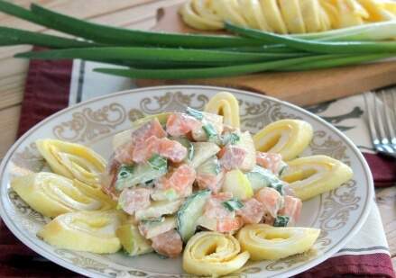 7. Выложите салат на блюдо, а по краям разложите кусочки омлета. Салат с копченым лососем и омлетом готов к подаче.