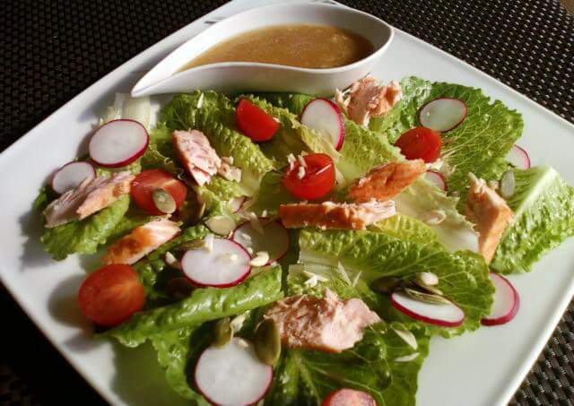 5. Разложите измельченный рыбу, редис и помидоры на листья салата, посыпьте миндалем и семенами тыквы, полейте заправкой. Весенний салат с печеным лососем готов к подаче на стол. Может подаваться как постное блюдо.