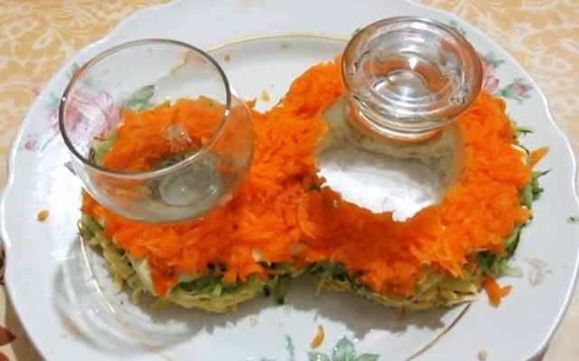 4. Начинайте выкладывать салат. На плоском блюде круглой или овальной формы на некотором расстоянии поставьте два стакана (бокала, баночки). Одна емкость должна быть немного меньше другой по диаметру.