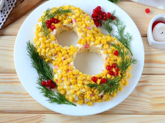 7. Последним верхним слоем уложите тертые яйца, слегка посолите, смажьте майонезом. Покройте салат консервированной кукурузой, украсьте веточками укропа и ягодами калины по своему вкусу и усмотрению.