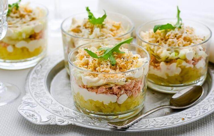 Закуски и салаты, уложенные слоями в прозрачную посуду, выглядят на столе очень выигрышно и эффектно. Если у вас предстоит вечеринка с друзьями, реализуйте идею легких и вкусных салатов в порционных емкостях. Предлагаем вашему вниманию отличный рецепт праздничного слоеного салата с рыбой в стаканах.