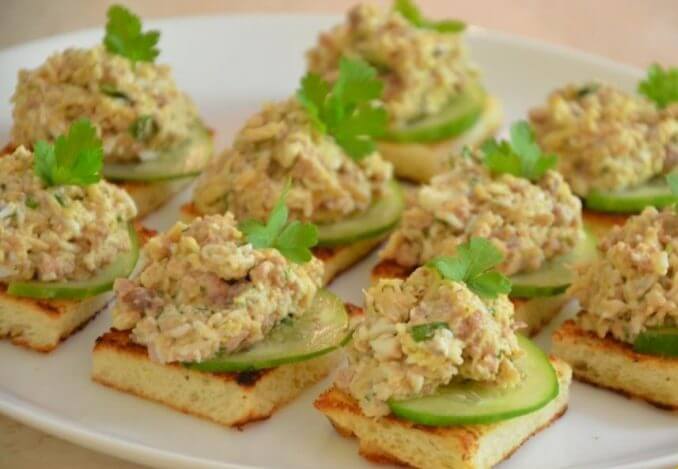7. Салат из печени трески на гренках готов к подаче на стол.