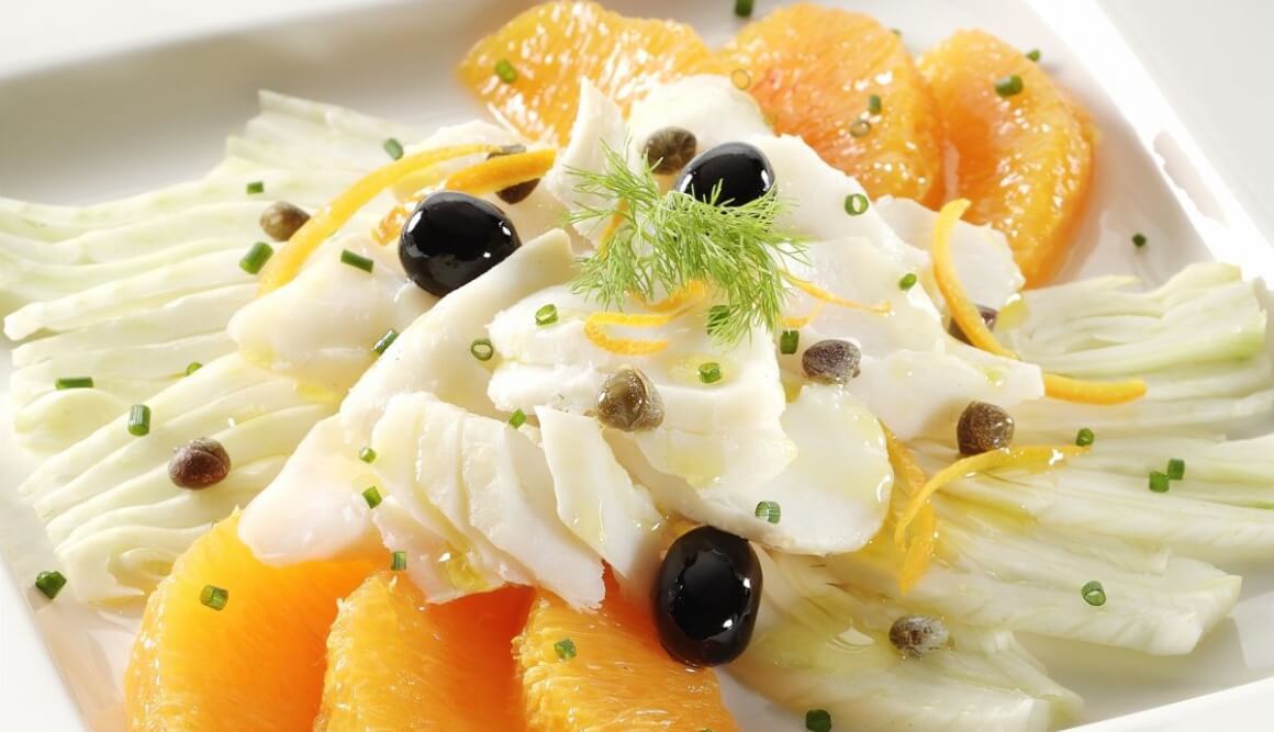 Салат из трески с фенхелем и апельсинами требует для приготовления 40-60 минут, включая варку трески, но выглядит на столе эффектно и имеет отличный неповторимый вкус.