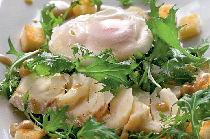 7. Разберите на кусочки филе трески и удалите все мелкие косточки. Добавьте к рукколе рыбы, а сверху выложите яйца-пашот и полейте остальной заправкой.