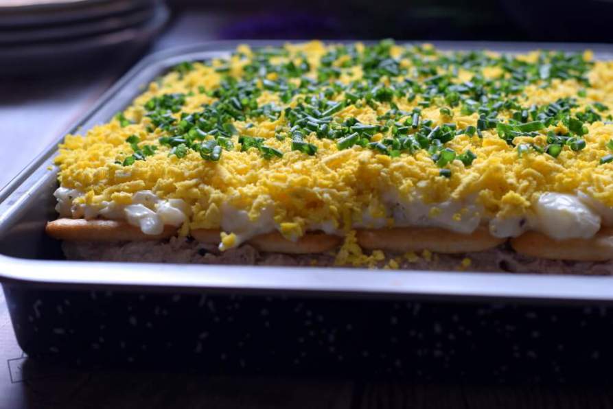 6. На сырный слой снова уложите 12 крекеров, на которые выложите тунцовую массу + 12 крекеров. На крекеры выложите белковую массу, разровняйте. Посыпьте сверху желтками, натертыми на среднюю или мелкую терку.