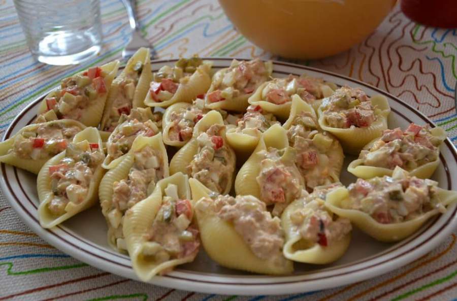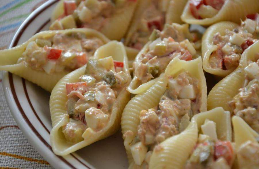 7. Приготовленным салатом с помощью чайной ложки наполните отваренные макаронные ракушки и уложите их на блюдо.