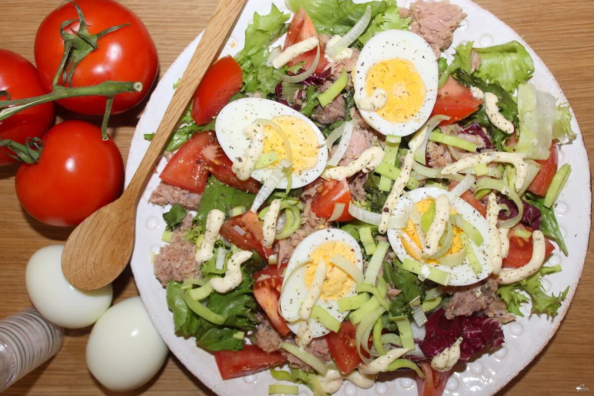 6.Сформированный салат с тунцом, яйцом и помидорами на блюде полейте приготовленным соусом винегрет и подавайте к столу. Вместо соуса винегрет можете использовать для заправки йогуртовый соус.