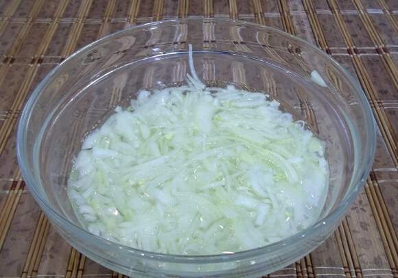 1. Репчатую луковицу очистите от шелухи, нарежьте как вы желаете (кубиками, перышками, полукольцами) и сложите в миску.