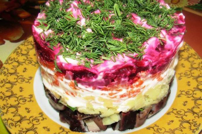 - слой свёклы, присолите и щедро смажьте майонезом.