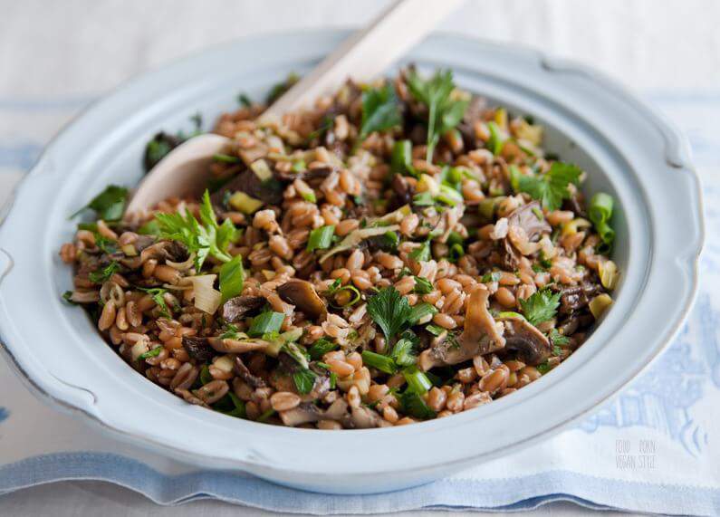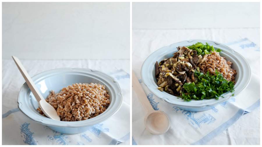 6. В большую широкую миску или салатник всыпьте приготовленную перловку, добавьте маринованные грибы вместе с маринадом, измельченный зеленый лук, зелень петрушки, влейте льняное масло и перемешайте. Попробуйте на вкус и, при необходимости, добавьте льняного масла, соли или молотого перца.