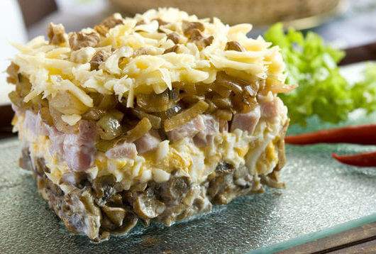 6. Теперь начните оформлять ваш салат. Первым слоем выложите картошку, смажьте майонезом, вторым слоем – жареные грибы с луком, третий слой – яйца, сверху снова смажьте майонезом или нарисуйте майонезную сеточку. Последний слой из тертого сыра тоже дополните майонезом.