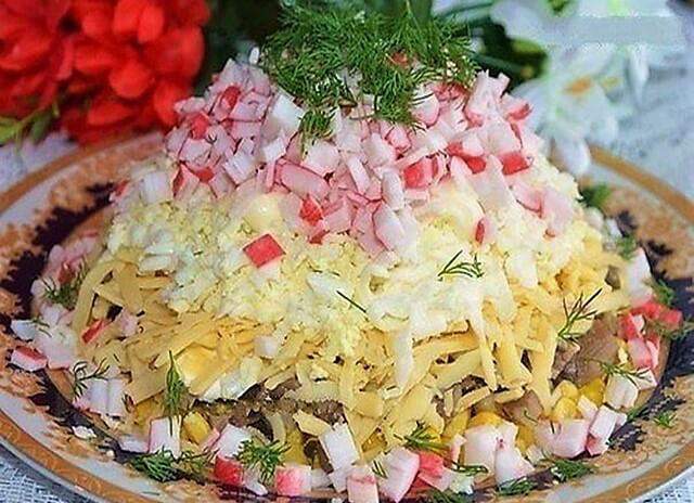 Готовим слоеный салат с грибами и крабовыми палочками