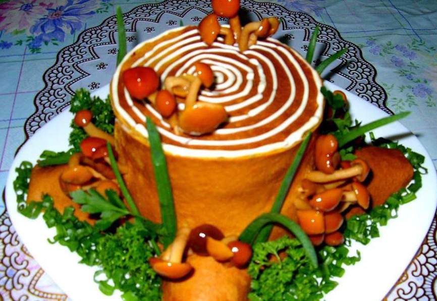 7. Обрезки блинов используйте для изготовления корней пенька с трех сторон, скрутив их в рулеты. «Рассадите» на пенек грибки, украсьте блюдо у основания зеленью. При помощи майонеза можете нанести на срез пенька «древесные кольца. Салат «Пенек» с опятами и ветчиной готов к подаче на стол.