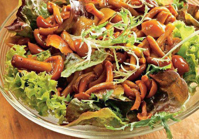 5. На тарелку или блюдо разложите салат, порвав его на крупные куски. На салат выложите еще теплые грибы.