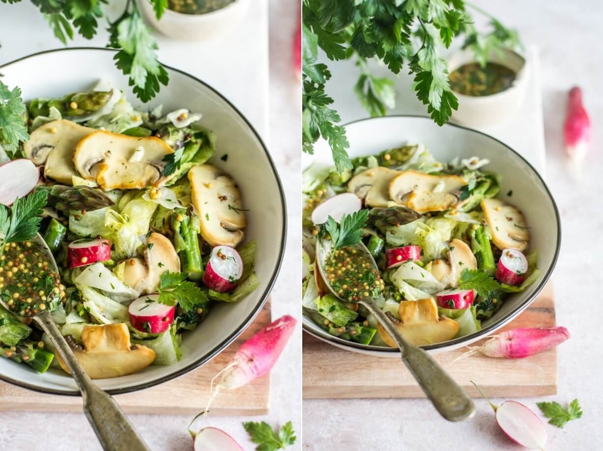 Салат с шампиньонами, редиской и спаржей отлично сочетается с хрустящим салатом айсберг и ароматной горчичной заправкой.