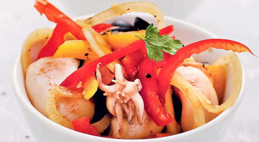 8. Салат из кальмаров с перцем и оливками следует подавать холодным.