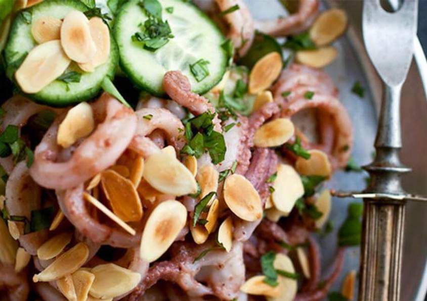 7. Подайте салат из щупальцев кальмара, посыпав поджаренными миндальными лепестками.