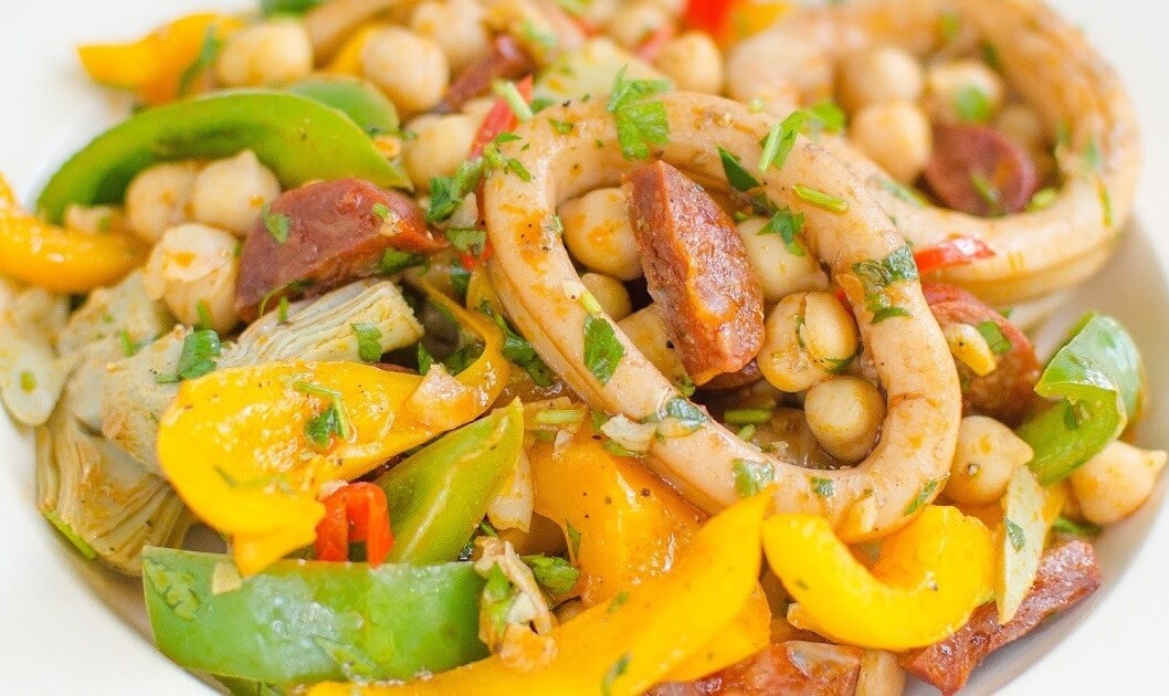 Готовим салат с кальмарами, чоризо, артишоками и нутом