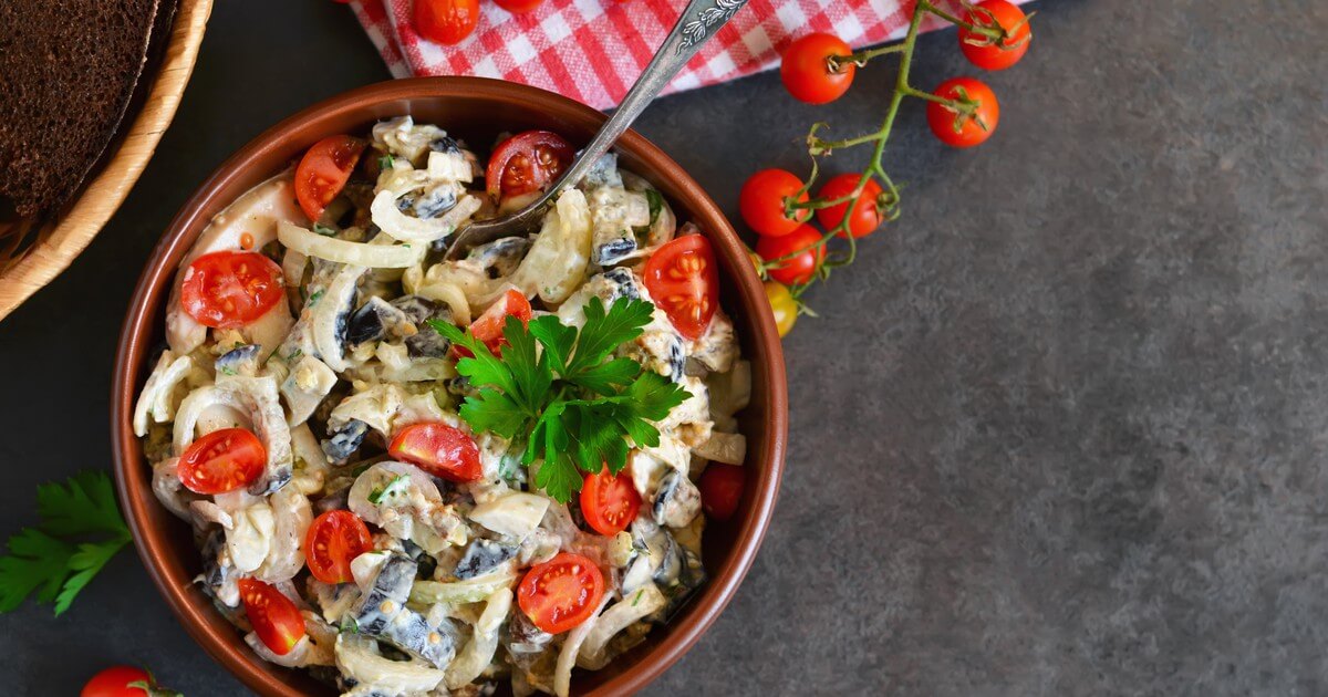 Готовим салат с курицей, кальмарами, грибами и помидорами