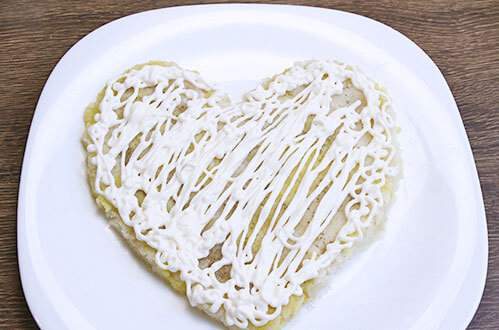2. Выложите картофельную массу на плоское блюдо, как основу салата, придавая ей форму сердца. Посолите слой картофеля, поперчите и смажьте обильно майонезом.