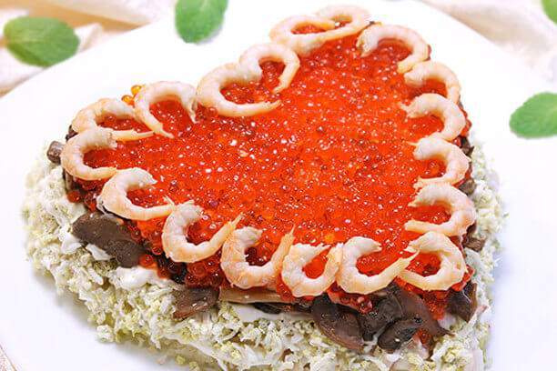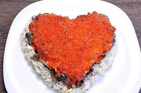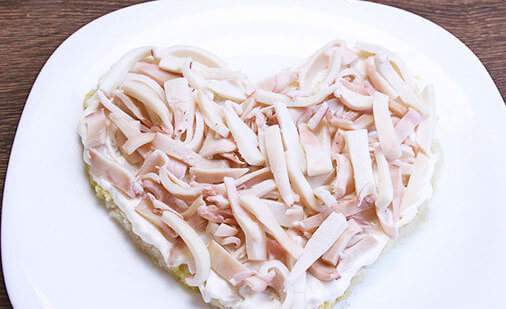 Готовим салат «Сердце ангела» с кальмарами и красной икрой