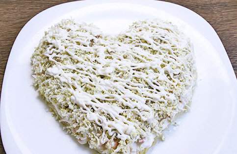 9. В качестве завершающего штриха красиво выложите по контуру сердца очищенные и отваренные креветки. Уберите блюдо в холодильник хотя бы на пару часов, чтобы все ингредиенты пропитались и объединили вкусы.