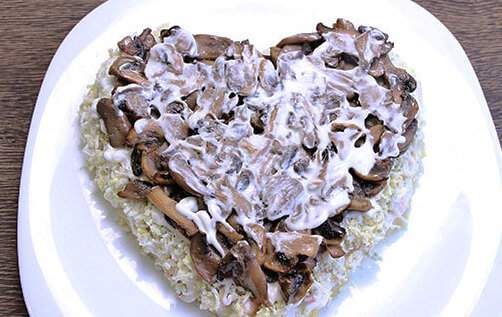 8. Твердый сыр натрите на мелкой терке, уложите на слой грибов и смажьте майонезом. Прослойка майонеза наносится на сыр последний раз. Затем равномерно покройте «сердце» салата красной икрой.