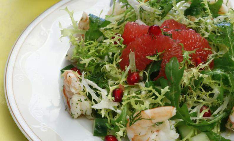 6. Добавьте к зелени огурец и перемешайте. Распределите салат по тарелкам. Выложите на салат дольки грейпфрута и креветки.