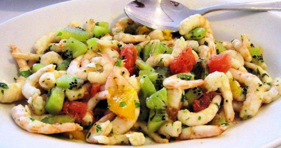 8. После того как салат с креветками и фруктами настоится 5-10 минут, подавайте его к столу.