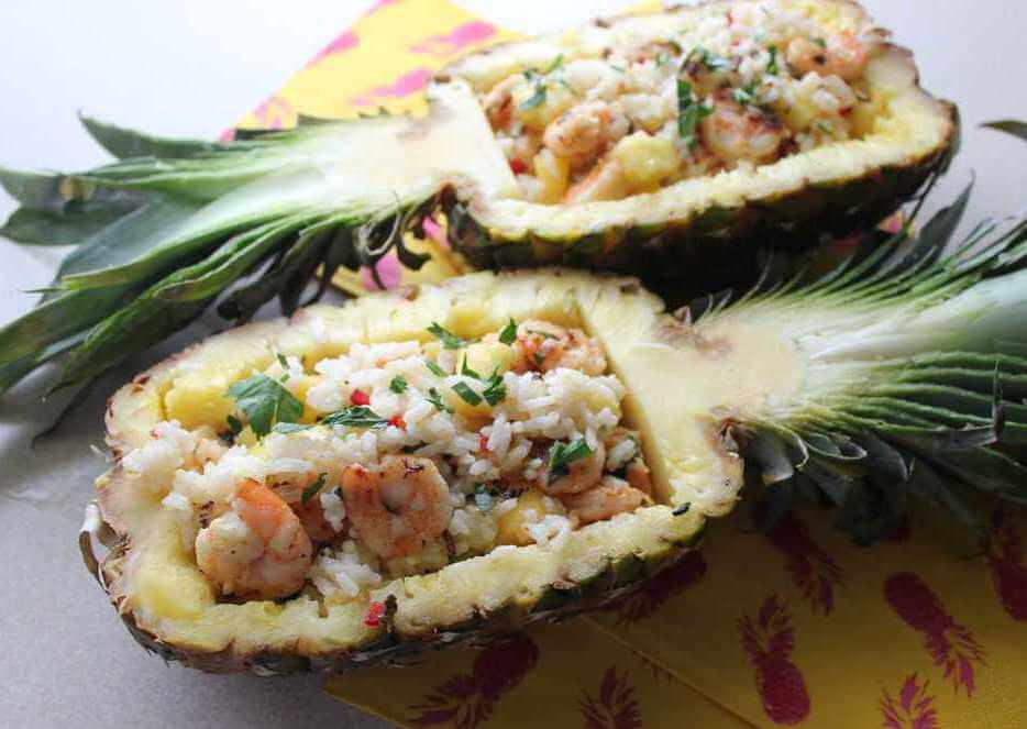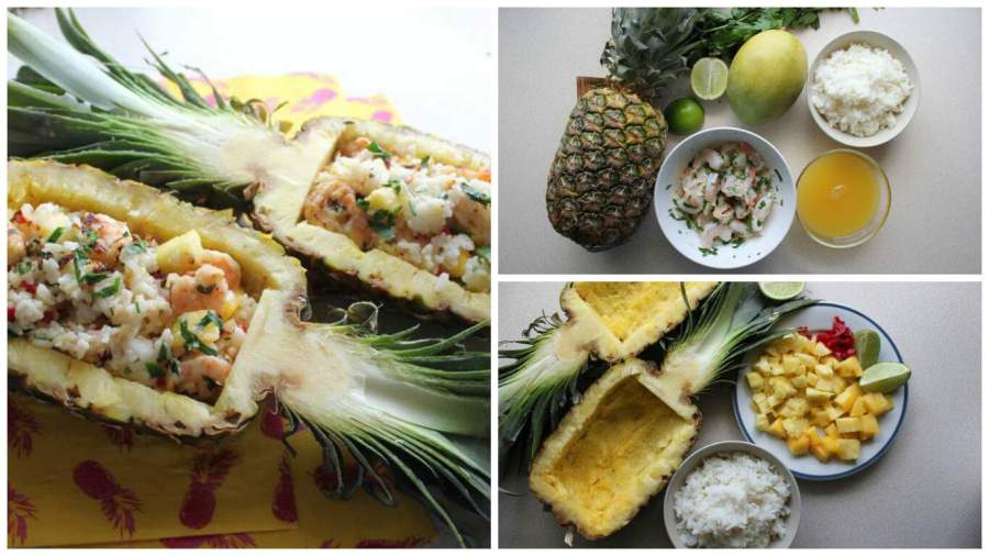 6. Маринованные креветки поджарьте на гриле или в сковороде и добавьте в салат. Обильно полейте заправкой, приготовленной из 4 ст. ложек ананасового сока, сока половины лайма, мелко нарезанной петрушки, соли и перца. Перемешайте.