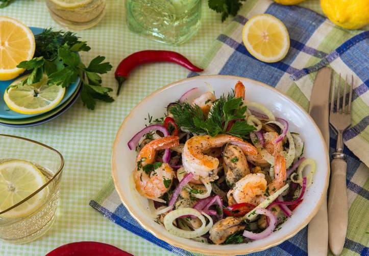 8. Сверху на овощи разложите мидии и креветки, взбрызните щедро лимонным соком, посолите и поперчите. Салат с мидиями, креветками и фенхелем готов к подаче на стол.