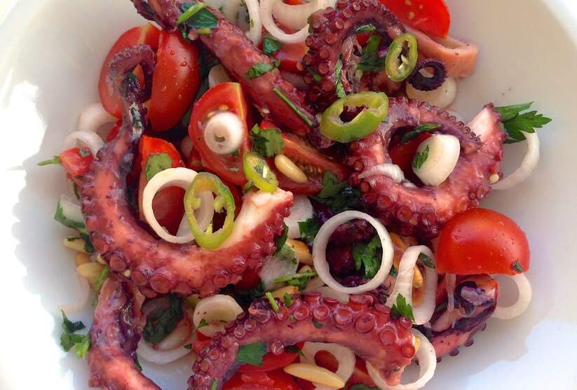 Салат из осьминога с помидорами и кедровыми орехами