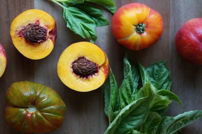 1. Отберите нектарины и помидоры для салата, вымойте их и обсушите на бумажном полотенце. Нектарины разрежьте вдоль пополам, удалите косточки и нарежьте дольками. Помидоры нарежьте на ломтики (не слишком крупные).
