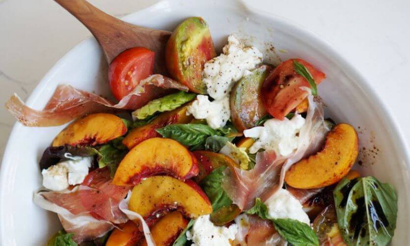 5. Салат из нектаринов с помидорами, моцареллой и ветчиной – идеальная идея для праздничного стола или пикника под открытым небом. В нем идеально сочетаются сочные сладкие нектарины и мясистые помидоры с пряной зеленью, моцареллой и соленой ветчиной.