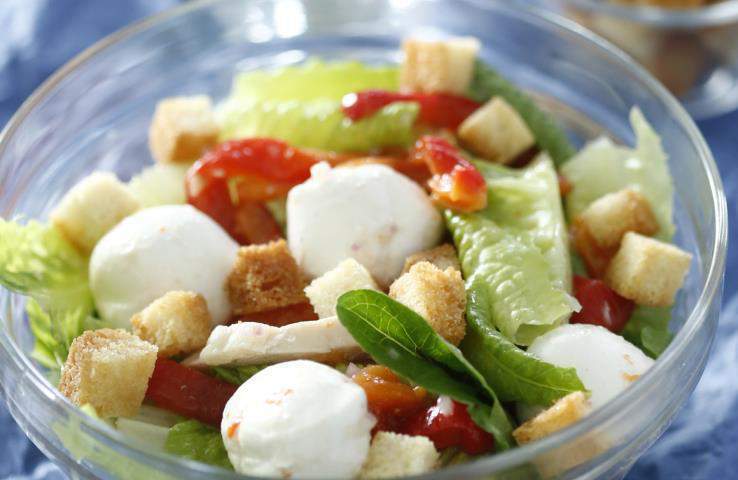 6. Перемешайте салат с моцареллой и курицей, а перед подачей посыпьте сухариками.
