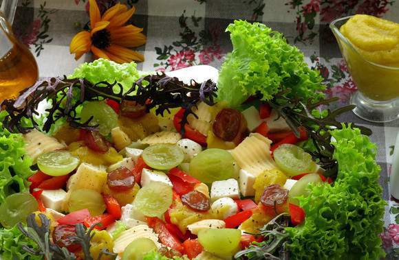 7. Дальше выложите перец и нарезанный фигурно твердый сыр, приправьте соусом, поперчите и посолите по желанию, выложите половинки винограда и руколу.