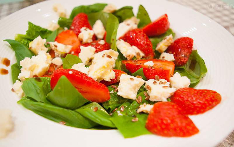 9. Летний салат с козьим сыром и клубникой готов к подаче на стол.